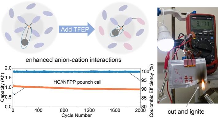 钠离子电池具有资源丰富和成本低廉的优点,是下一代大规模储能技术潜在的候选者之一。大规模储能技术对电池安全性的要求更加苛刻,目前钠离子电池使用的碳酸酯类电解液高度易燃,这使得电池在热失控条件下会起火甚至是爆炸。磷酸酯是一类阻燃溶剂,使用磷酸酯作为电解液可以大大提升电池的安全性,然而磷酸酯溶剂较差的还原稳定性会导致电解液和电极材料的电化学兼容性差,使得钠离子电池无法长寿命工作。近日,曹余良&方永进团队采用阴阳离子相互作用调节策略,成功设计了电化学兼容性良好的磷酸酯电解液,实现了高安全和长寿命的钠离子电池。
